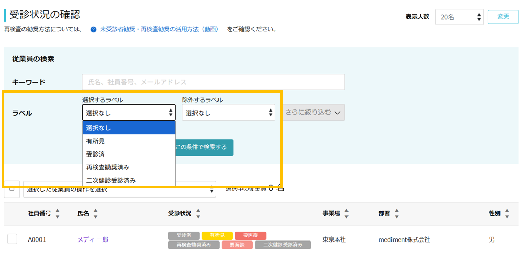 ▼ラベル・・・軽度異常、要再検査、要医療 などで抽出できます