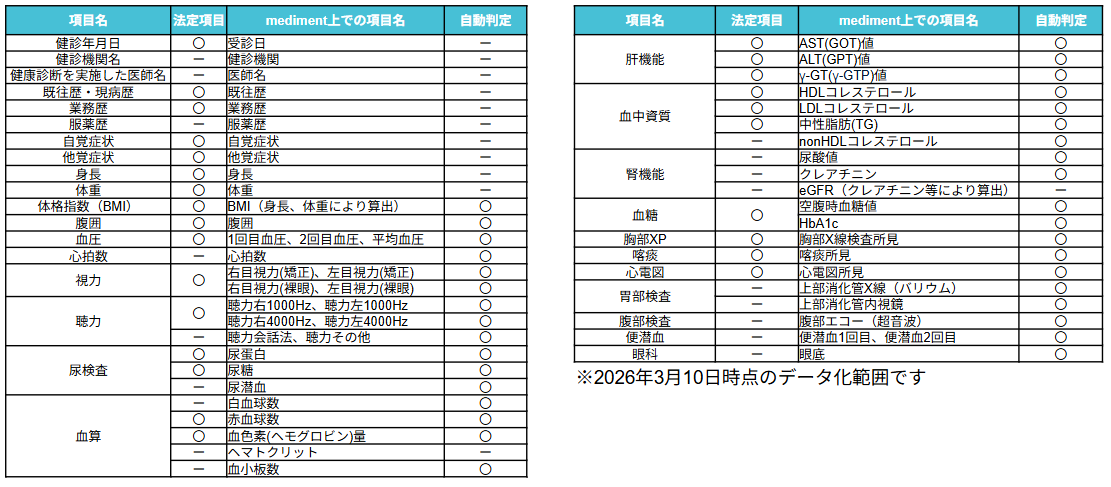 ▼medimentでデータ化・自動判定を行う項目