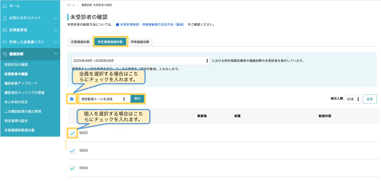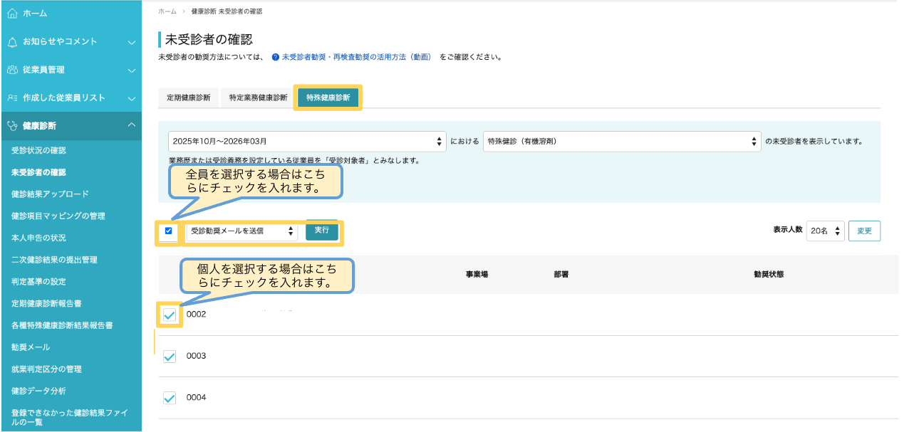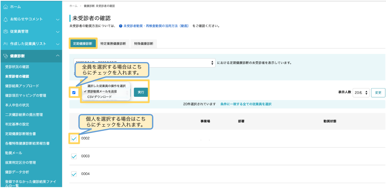 2.未受診者を選択してメールを送信する
