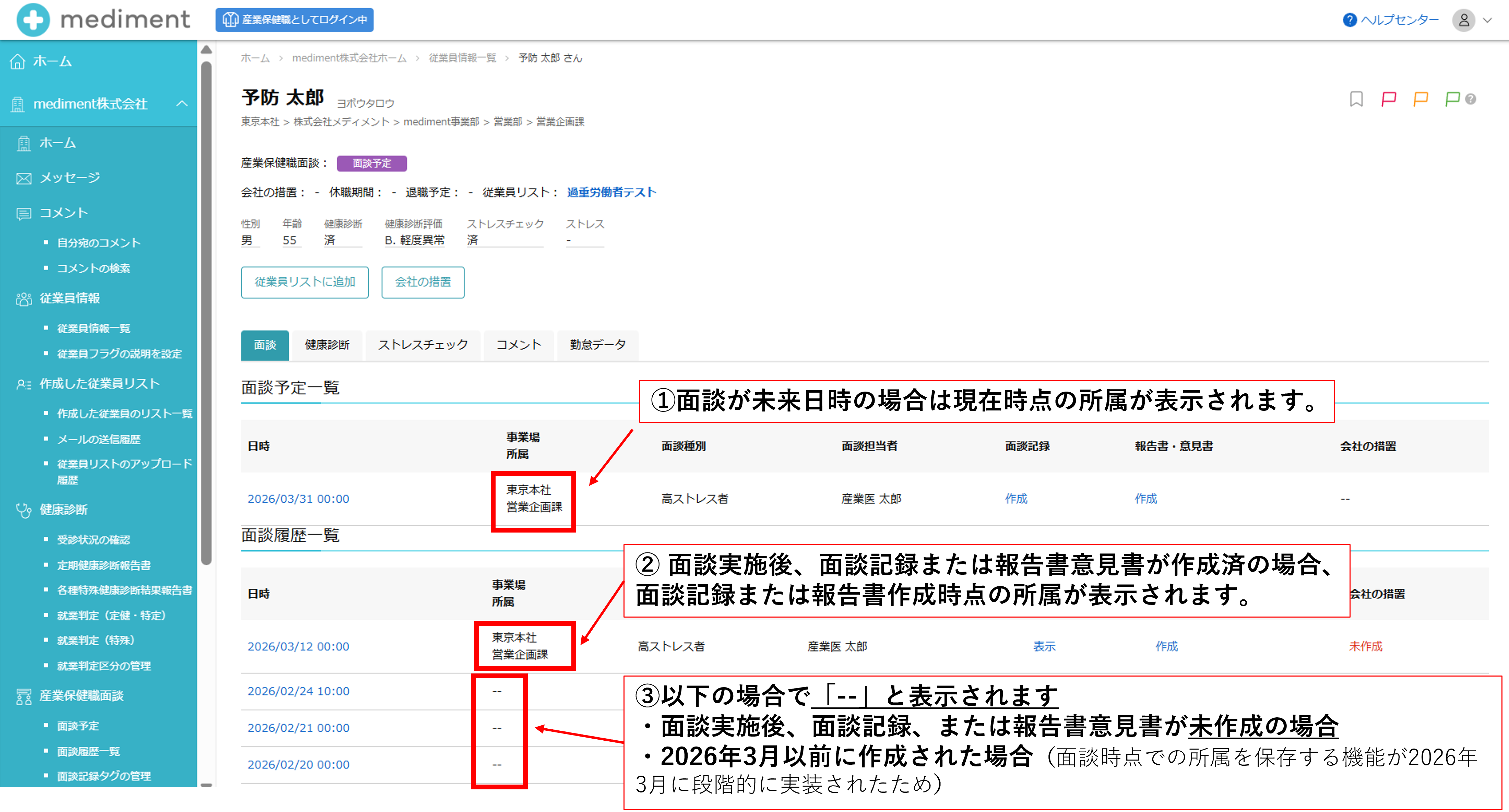 面談予定作成時に、診断書等のファイルを添付することも可能です。添付したファイルは、労務管理担当者と産業保健職が事前に確認できます。