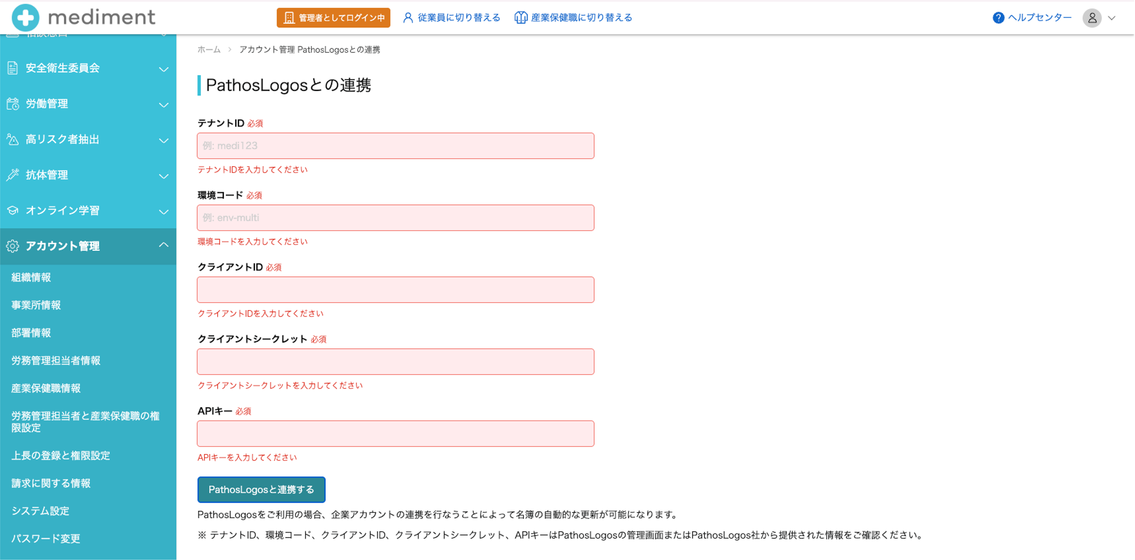 左メニューの「アカウント管理」>「PathosLogosとの連携」を選択することで設定画面へ遷移できます。