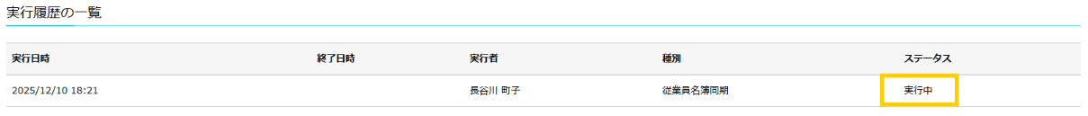 同期を開始すると「実行履歴の一覧」に「実行中」ステータスで表示されます。